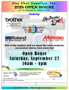 14 Aug Open House 2025 – Saturday, Sept. 27th, 10am-4pm Byoneshotsupplies// Comments are Off// Uncategorized Click HERE to Signup Previous: Holiday Schedule 2025 Next: Stahls Hotronix Summer Promo